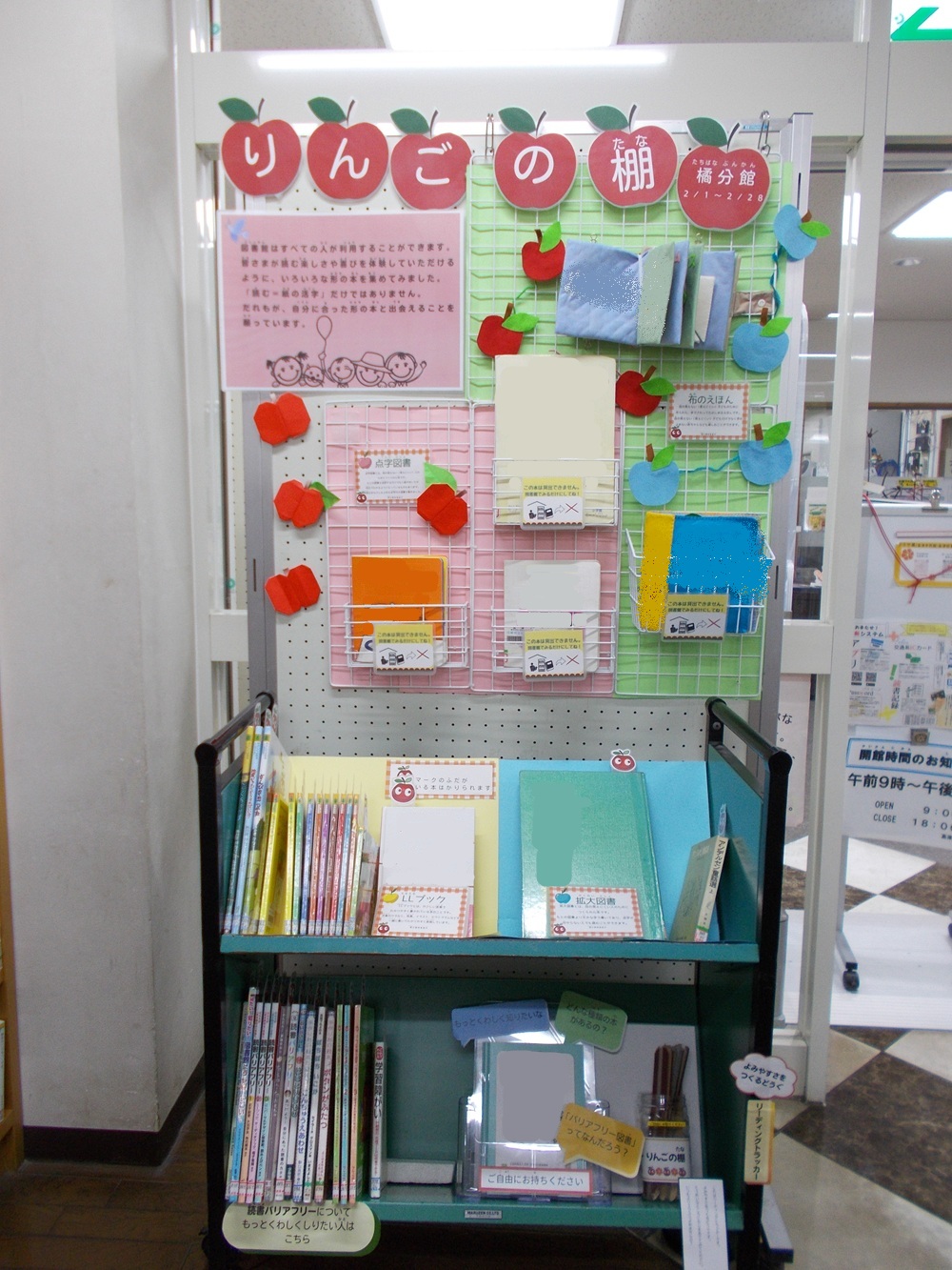 橘分館では、主に「拡大図書」「LLブック」「点字図書」の展示・貸出を行います。
