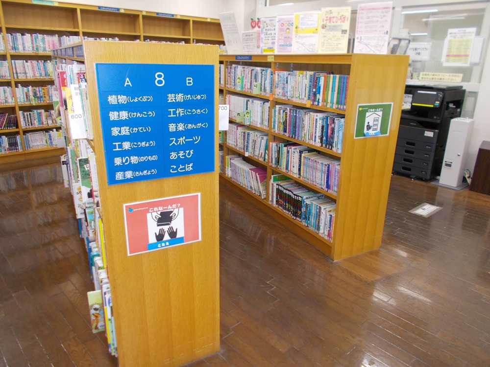 館内の児童書コーナーでは、ピクトグラムのクイズを掲示しています。