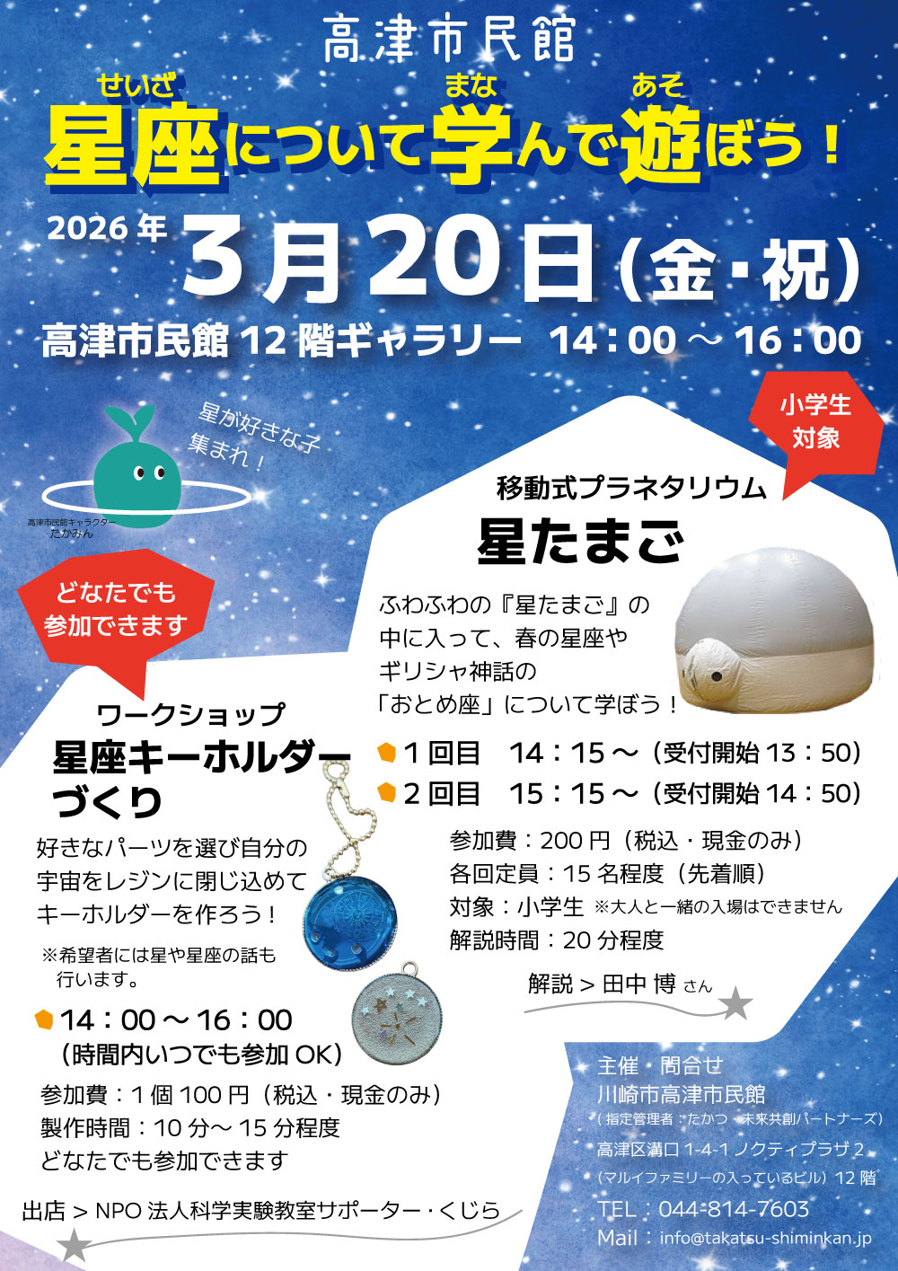 ※星座キーホルダーづくりは、開場時間内いつでも参加できます。作業席が埋まっている場合は少しお待ちいただく場合がございますのでご了承ください。星座について知りたいことがあったら、キーホルダーを作りながら聞いてみてください。